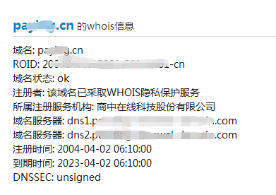 有开通.cn/.中国域名隐私保护服务 whois显示: